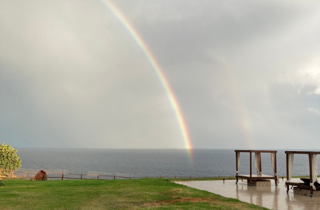 glück ist, wenn ein regenbogen auftaucht – ein ende im meer versinkt